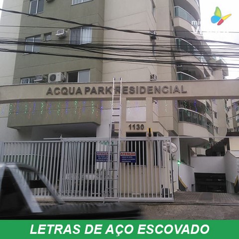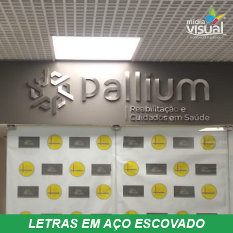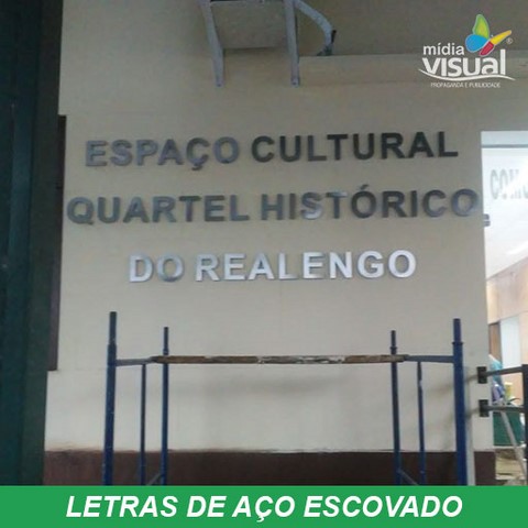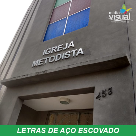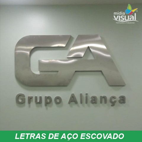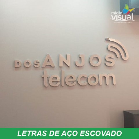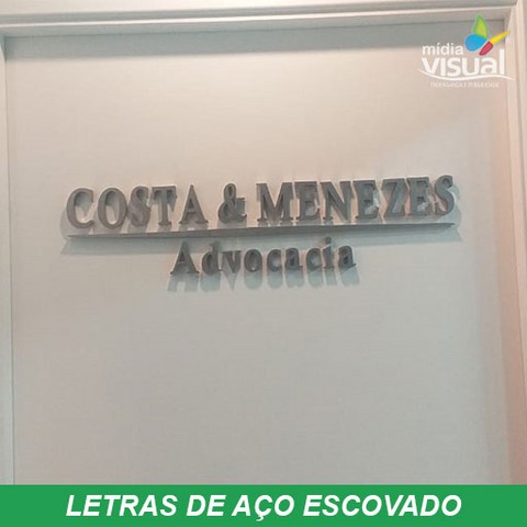 Aço escovado inoxidável ( qualidade 304 ) confeccionadas a base de recorte a laser, montadas com soldas 50×50, lateral ( espessura ) de acordo com o tamanho das letras, fixação a base de pinos central, orelhas com ou sem afastamento, base para colar com fita dupla face ou cola especial. Para espessuras maiores que 25mm o acabamento é feito com tinta PU automotiva, fixadas a base de fita dupla face da 3m ou cola especial, podendo também ser com pinos central.