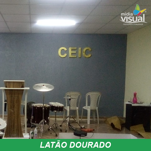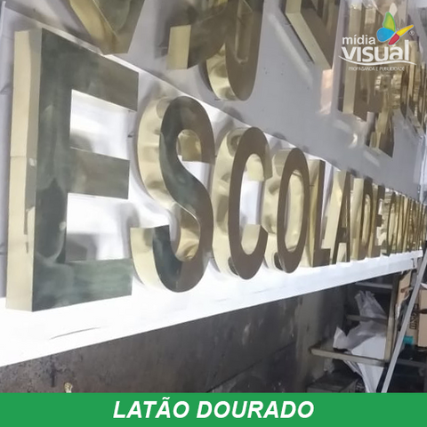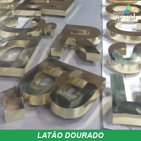 Latão polido (Dourada), confeccionadas a base de recorte a laser, montadas com soldas 50×50, lateral ( espessura ) de acordo com o tamanho das letras e logomarca, fixação a base de pinos normais, orelhas com ou sem afastamento, base para colar com fita dupla face ou cola especial.