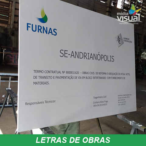 Confeccionada em chapa galvanizada, PVC ou alumínio, com laminação de adesivos vinil refletido, com letras e logotipo, feito em recorte eletrônico (Plotter ) adesivadas nas placas a base de mascara. A estrutura pode ser feita com sarrafo de madeira de 2×2 ou 3×2. ou também com estrutura metálica.