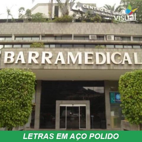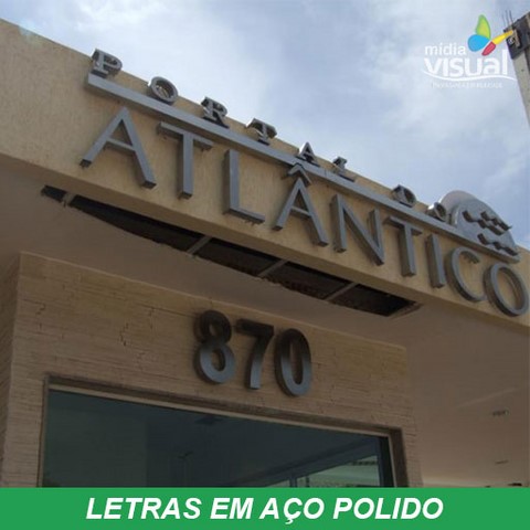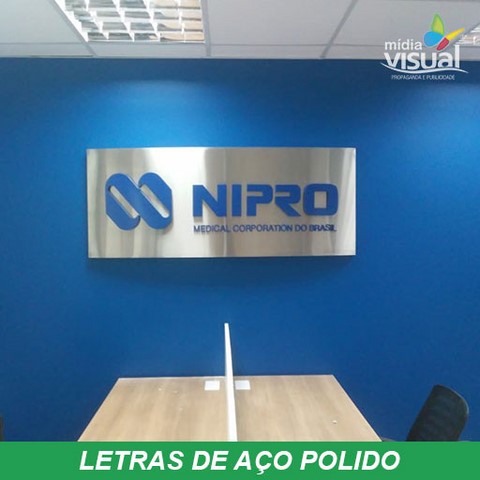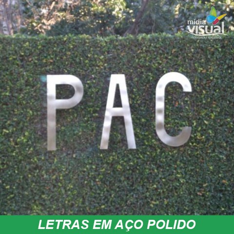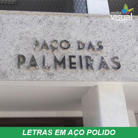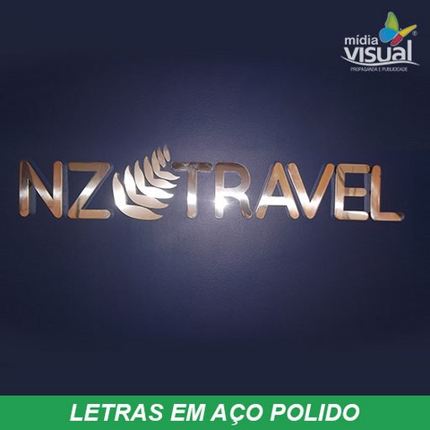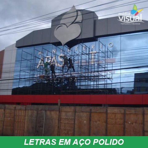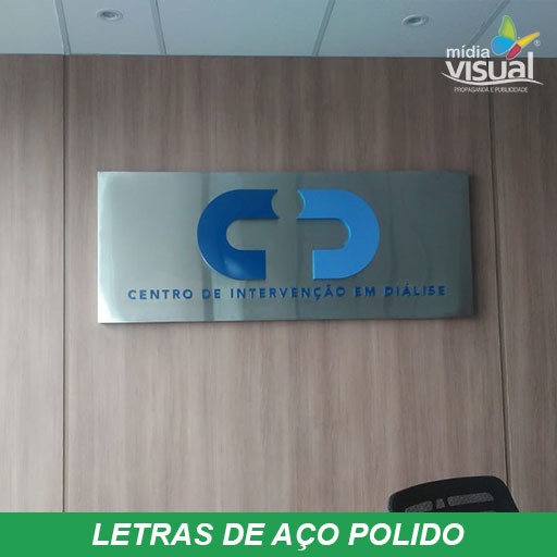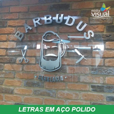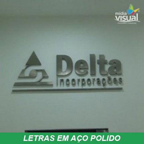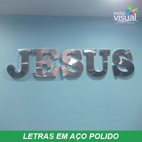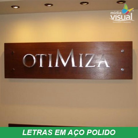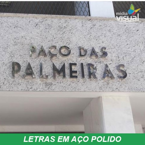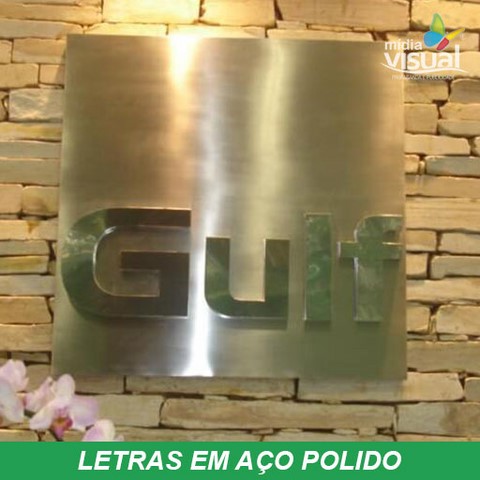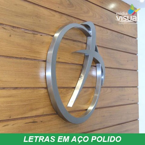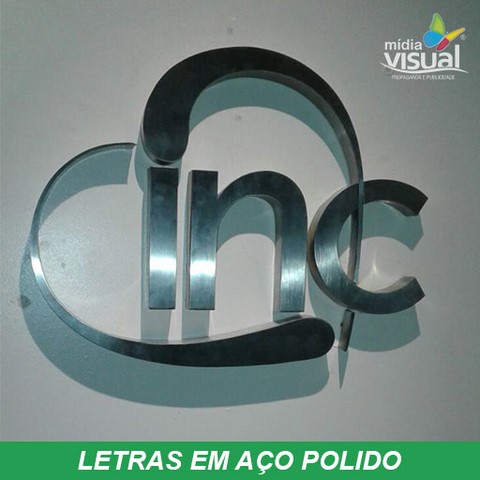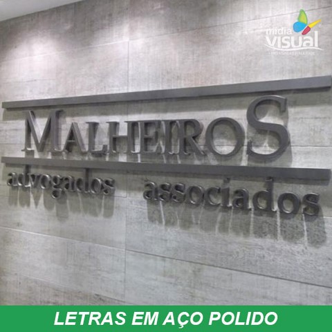 Aço polido ou escovado inoxidável ( qualidade 304 ) confeccionadas a base de recorte a laser, montadas com soldas 50×50, lateral ( espessura ) de acordo com o tamanho das letras, fixação a base de pinos central, orelhas com ou sem afastamento, base para colar com fita dupla face ou cola especial. Para espessuras maiores que 25mm o acabamento é feito com tinta PU automotiva, fixadas a base de fita dupla face da 3m ou cola especial, podendo também ser com pinos central.