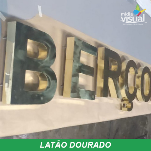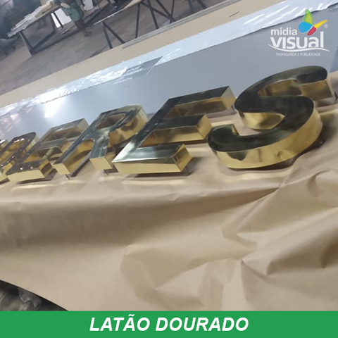 Latão polido (Dourada), confeccionadas a base de recorte a laser, montadas com soldas 50×50, lateral ( espessura ) de acordo com o tamanho das letras e logomarca, fixação a base de pinos normais, orelhas com ou sem afastamento, base para colar com fita dupla face ou cola especial.