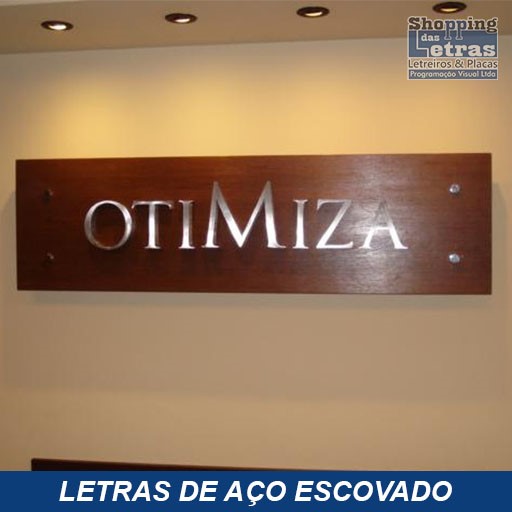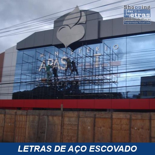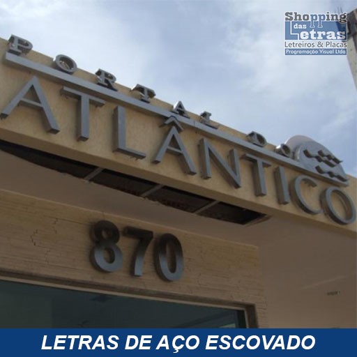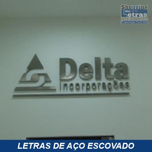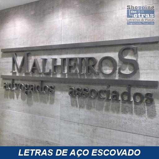 Aço escovado inoxidável ( qualidade 304 ) confeccionadas a base de recorte a laser, montadas com soldas 50×50, lateral ( espessura ) de acordo com o tamanho das letras, fixação a base de pinos central, orelhas com ou sem afastamento, base para colar com fita dupla face ou cola especial. Para espessuras maiores que 25mm o acabamento é feito com tinta PU automotiva, fixadas a base de fita dupla face da 3m ou cola especial, podendo também ser com pinos central.